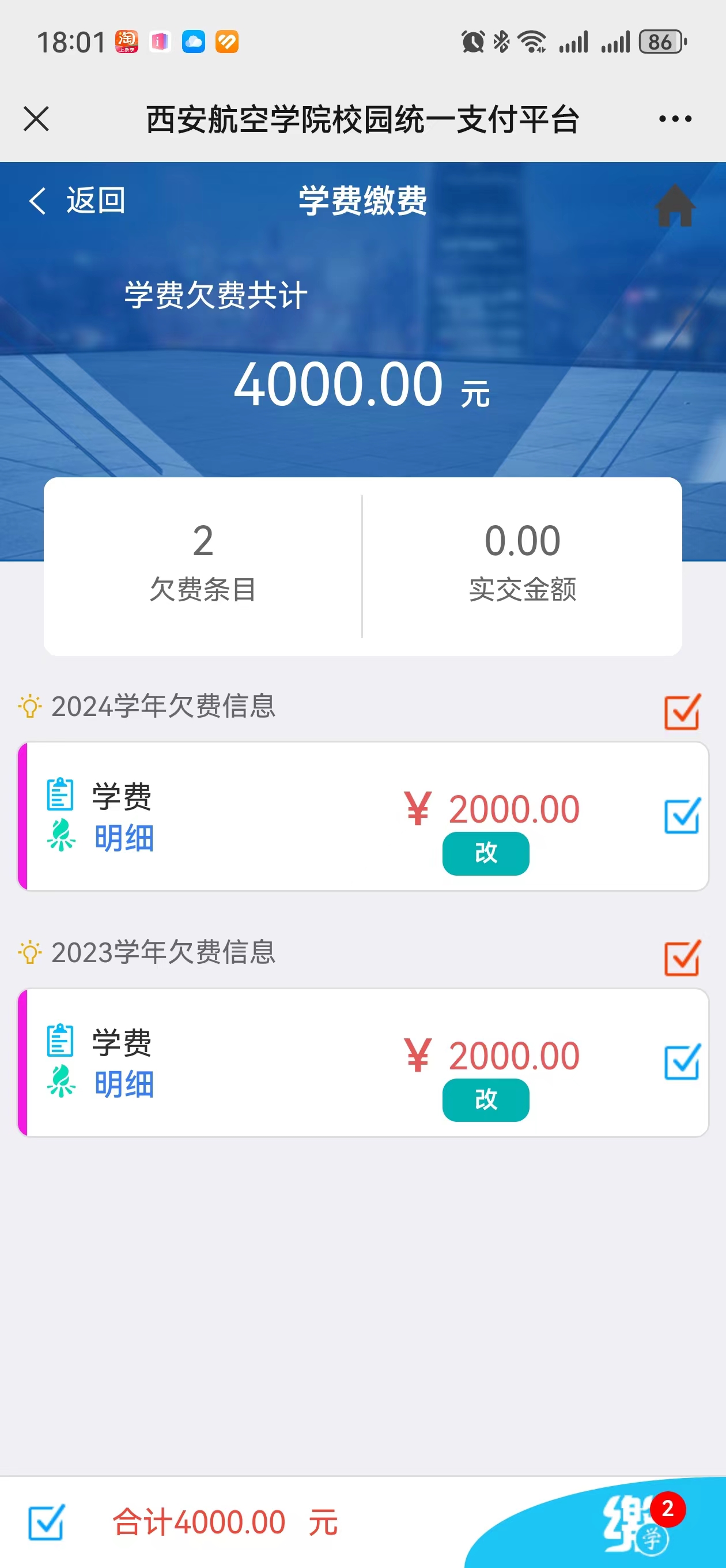登录后系统显示当前登录账号的欠费信息。点击缴费,选择微信或工行聚合码按提示进行支付。