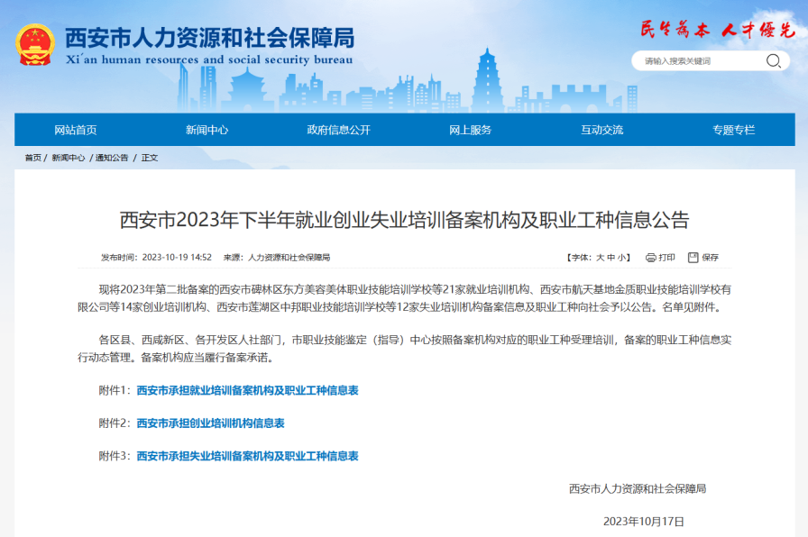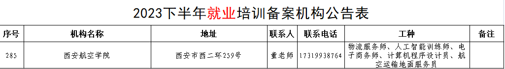 近日,西安市人力资源和社会保障局发布《西安市2023年下半年就业创业失业培训备案机构及职业工种信息公告》,Beat365官网成功获批西安市就业、创业、失业培训机构。今后Beat365官网可开展创业培训和物流服务师、人工智能训练师、电子商务师、计算机程序设计员、航空运输地面服务员等6个工种的就业失业培训,为Beat365官网应届毕业生提供优质的职业技能培训服务,提升应届毕业生就业质量。