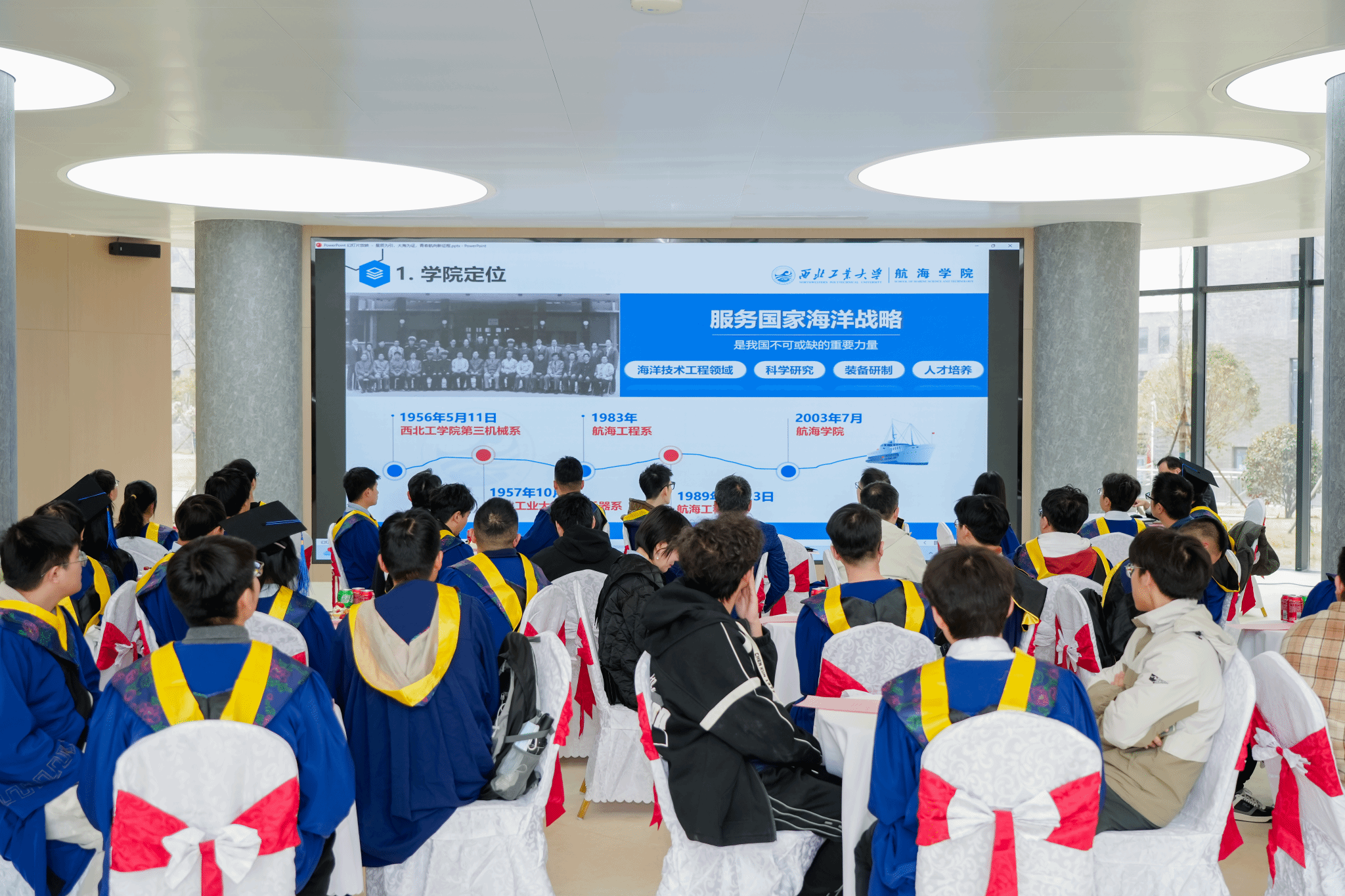 潘光院长为同学们讲授离校前最后一课。他与同学们分享了作为大国重器的某型无人水下潜航器的初心使命与研发历程,展示了作为航海人的爱国热忱与敢为人先的担当精神,并寄语全体优秀毕业生们:“勿忘昨天的苦难辉煌,无愧今天的使命担当,不负明天的伟大梦想”,激励全体优秀毕业生“为实现第二个百年奋斗目标,为实现中华民族伟大复兴的中国梦而不懈奋斗”。