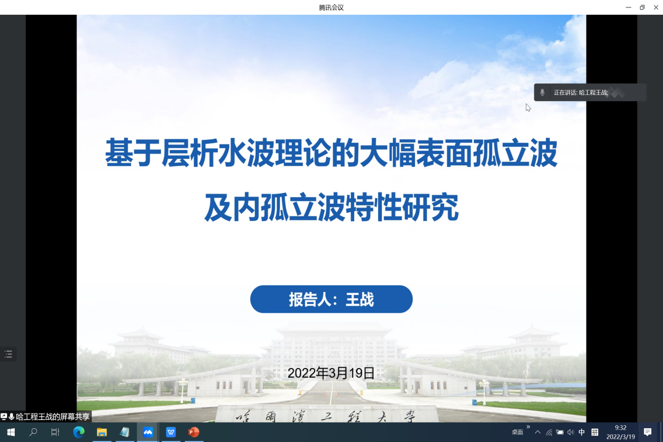 3月19日,应欧冠官网杜鹏副教授的邀请,哈尔滨工程大学船舶工程学院和哈尔滨工程大学青岛创新发展中心联合博士后王站,在线上为学院师生作“航海大讲堂”系列讲座(十四)——《基于层析水波理论的大幅表面孤立波及内孤立波特性研究》的学术报告。会议由杜鹏副教授主持,学院10余名师生参会。