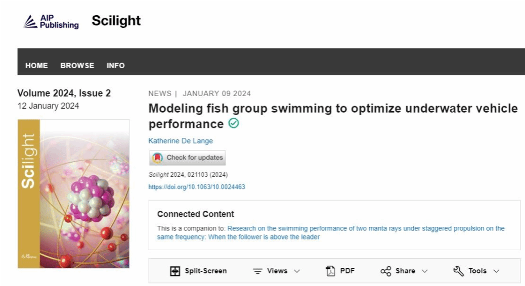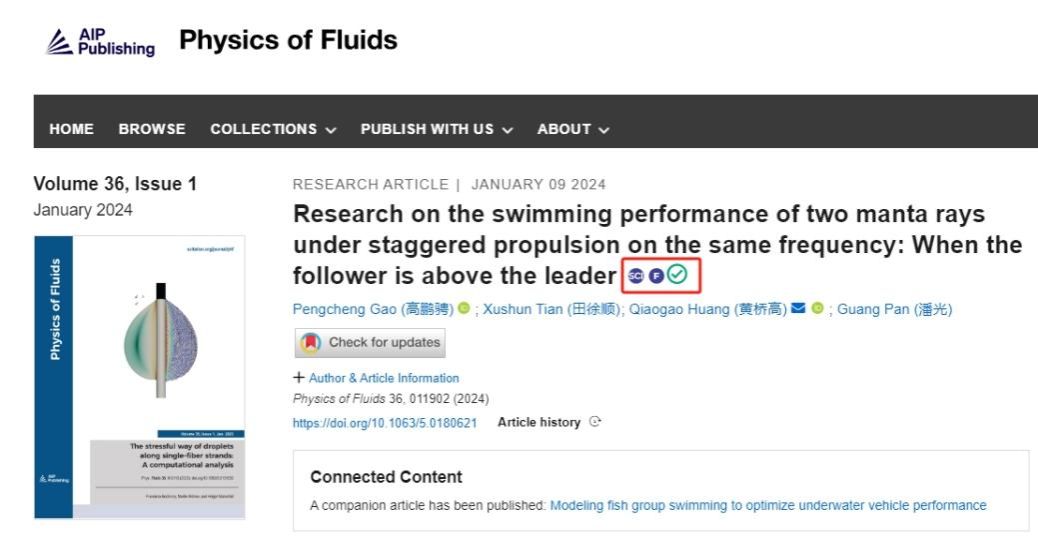 近期,欧冠官网潘光教授团队发表题为“Research on the swimming performance of two manta rays under staggered propulsion on the same frequency: when the follower is above the leader”的研究论文。该研究成果被国际流体力学知名期刊《Physics of Fluids》作为主编推荐特色文章(Featured Articles)发表(图一),并被美国物理学联合会“科学之光”(Scilight)专题文章采访报道(图二)。欧冠官网2020级博士生高鹏骋为该论文的第一作者,欧冠官网黄桥高教授为该论文的通讯作者。