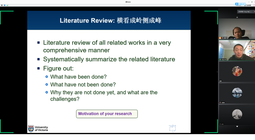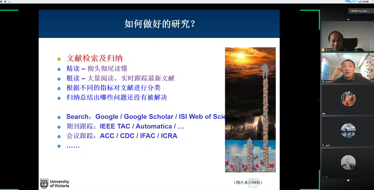 7月3日上午10:30,加拿大维多利亚大学施阳教授应欧冠官网李慧平教授的邀请,为学院师生作题为博士生培养和博士生科学研究方面的线上学术报告会。会议由李慧平教授主持,学校200余名师生参会。报告会从10:30持续到13:00,由两组报告组成,分别为:报告一《如何开展博士阶段的学习和开题》;报告二《如何开展博士阶段的文献综述和科学研究》。