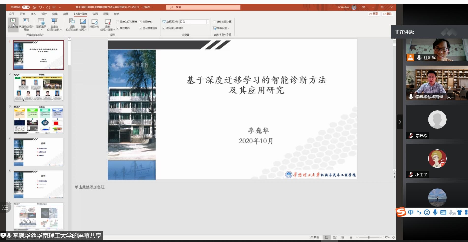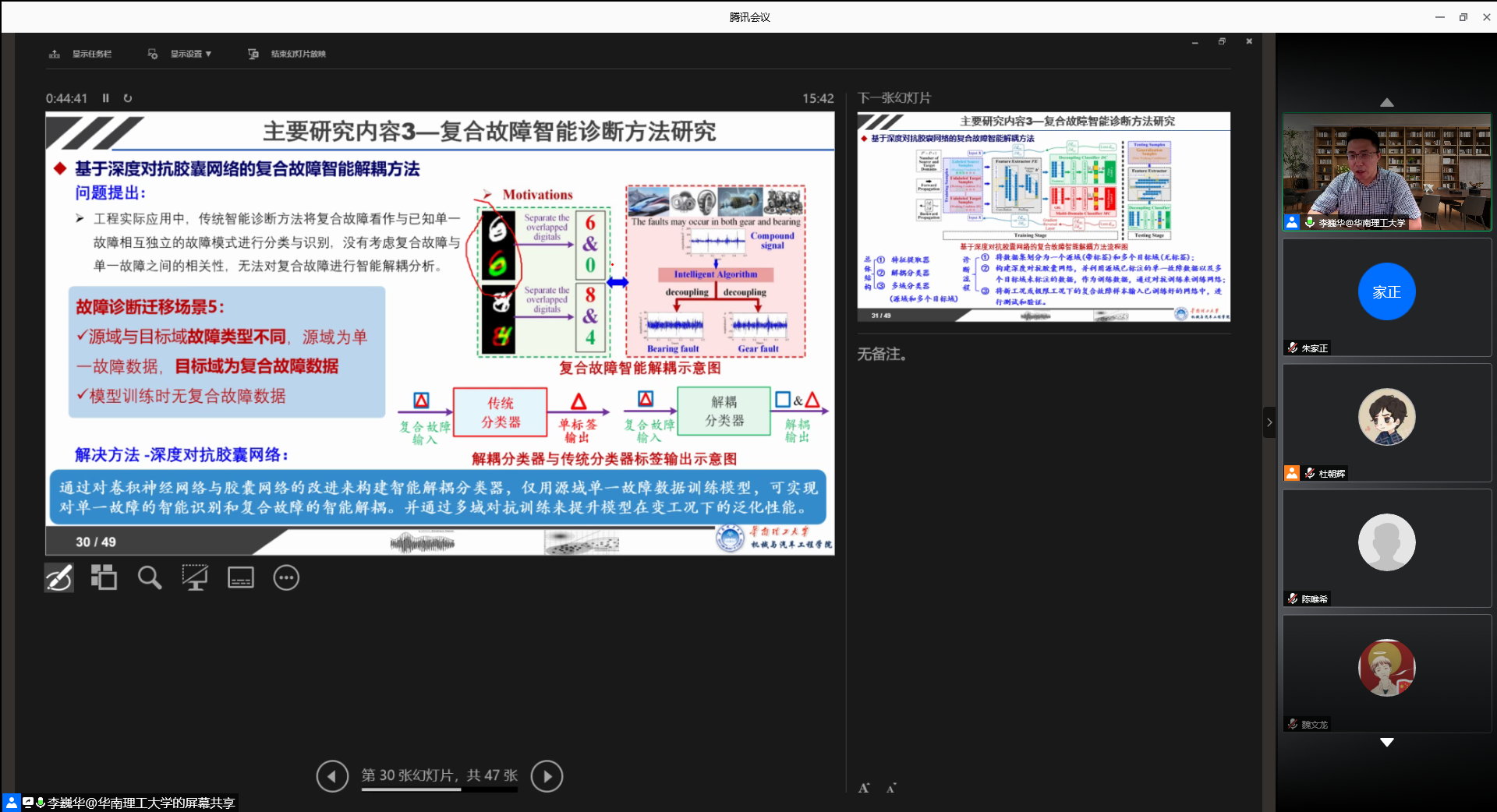 10月14日下午15:30,华南理工大学李巍华教授应欧冠官网杜朝辉老师的邀请,为学院师生作了题目为《基于深度迁移学习的智能诊断方法及其应用研究》的线上学术报告并展开了深入研讨交流。会议由杜朝辉主持,学院30余名老师和学生参加了此次报告会。