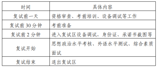 复试内容包括思想政治水平考核、外语水平测试和综合素质面试三部分,每部分100分;每生总复试时间不少于20分钟。