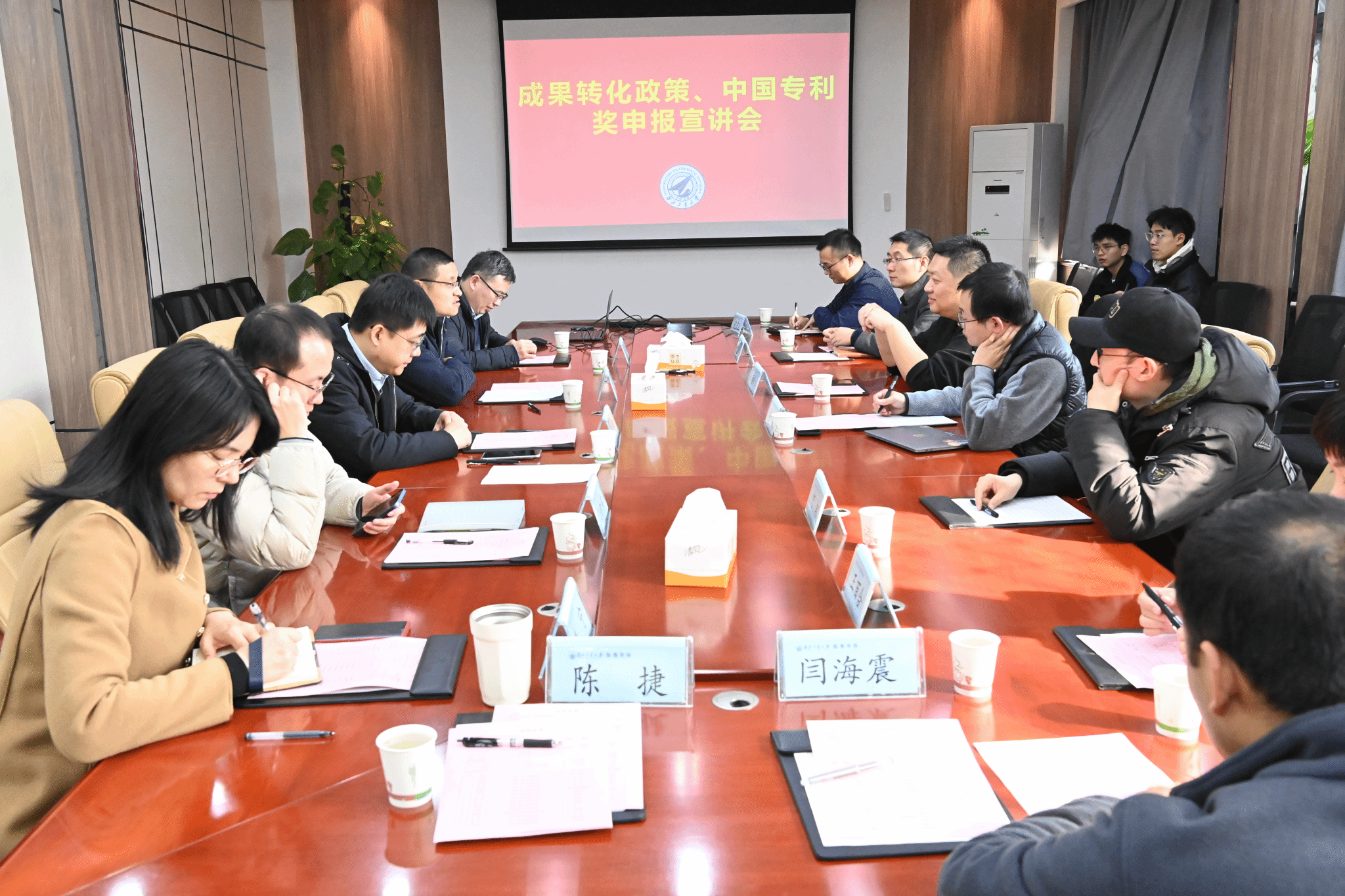崔荣鑫详细介绍了落实“127”目标责任制对学院成果转化、中国专利奖申报的新要求。顾潮琪从高价值专利布局、专利信息利用、专利文件撰写、专利申请流程、科技成果转化五个方面解读了知识产权保护实务。随后,与会人员分别围绕各自工作中遇到的问题展开探讨与交流,顾潮琪对此进行了一一解答。