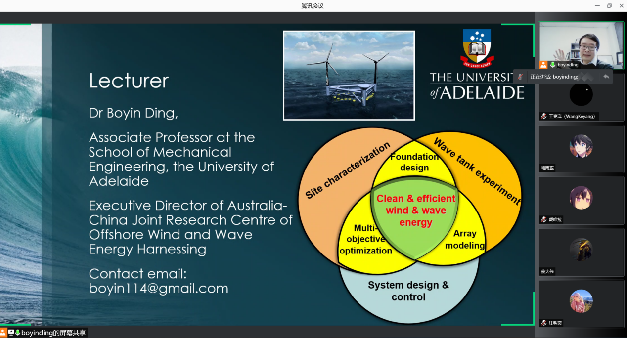 7月6日至8月11日,应欧冠官网任树伟老师邀请,阿德莱德大学Boyin Ding副教授于线上开展了波浪能捕获概论课程。