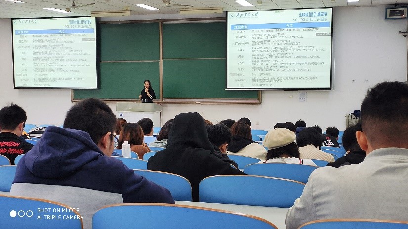 其次,张老师通过具体实例分析为同学们详细地讲解心理测评结果如何解读,并提醒同学们“认真对待测评过程,看淡测评结果”,不要以一次测评结果作为自己的行事准则和标准。同时强调新生心理测评结果并不会影响到同学们奖助学金的评定、考研、就业等各个方面,只是帮助同学们更健康的生活。
