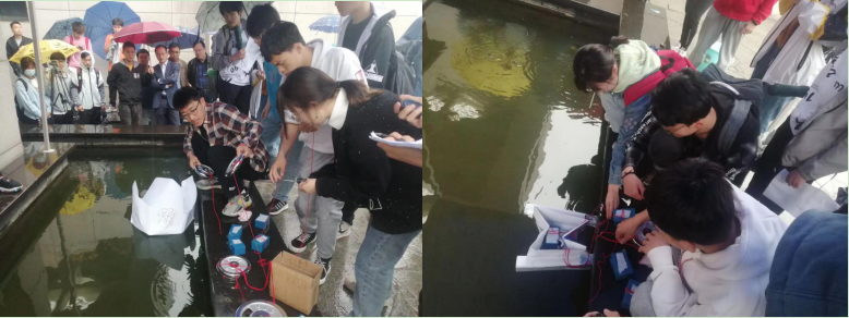 一方面是对纸船结构的创新,除了传统的盒型纸船外,有的小组尝试制作的锥形纸船,分片纸船,阀形纸船都令在场的同学眼前一亮,同时也有部分参赛同学在传统构型上寻求新的发展,在诸如支撑结构等方面进行新的探索。