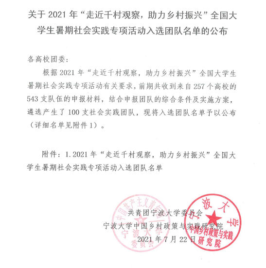 近日,欧冠官网“苹”凡之力扶贫助农实践队成功入选宁波大学团委、宁波大学中国乡村政策与实践研究院组织的2021年“走近千村观察,助力乡村振兴”全国大学生暑期社会实践专项活动。据了解,前期主办方共收到来自257所高校的543支队伍申报材料。结合申报团队综合条件及实施方案,遴选产生了100支社会实践团队。