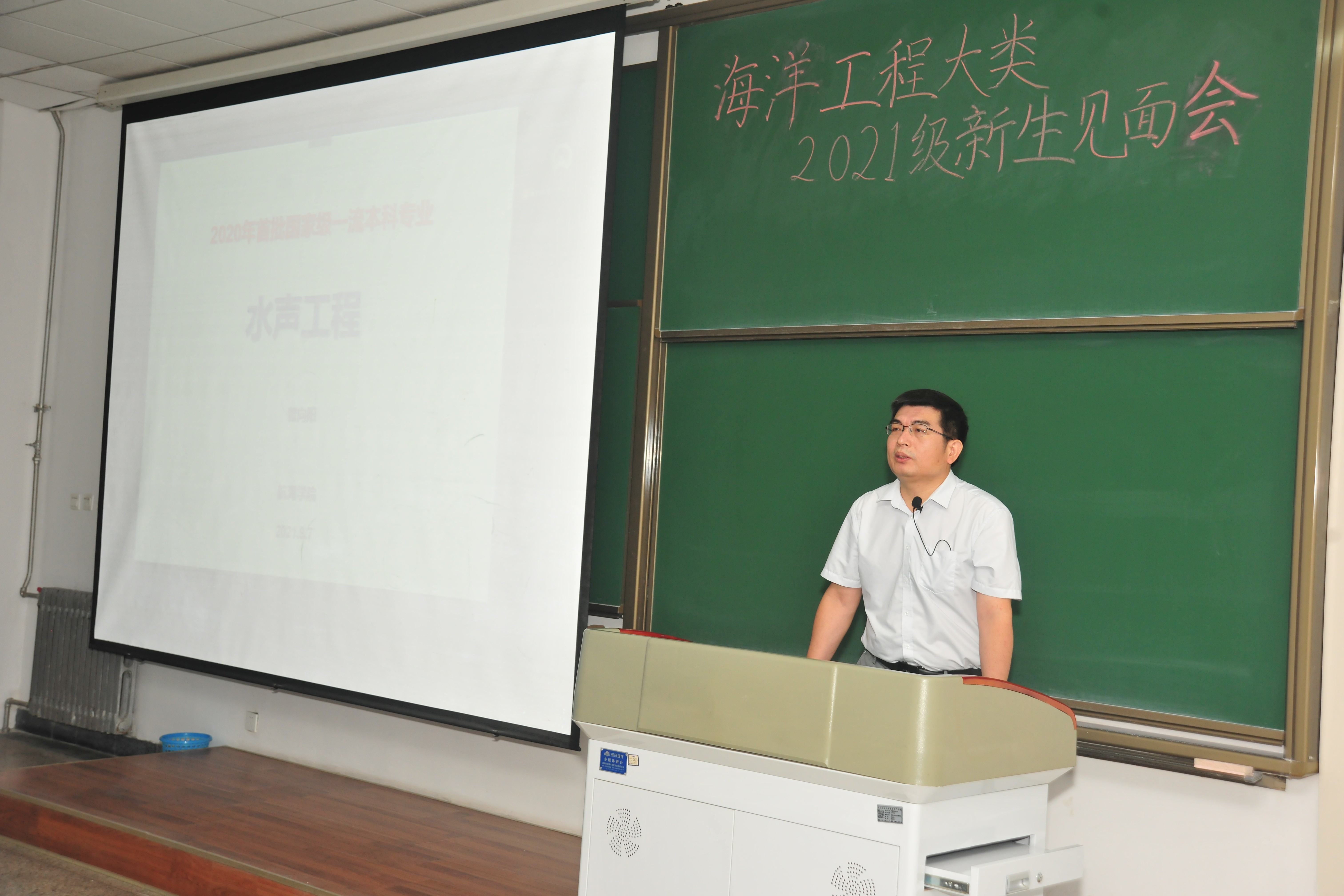 随后,专业负责人分别做专业介绍。船舶与海洋工程专业负责人胡海豹教授、水声工程专业负责人曾向阳教授、信息工程专业负责人张群飞教授分别从专业概况、师资队伍、教学团队、科研获奖、人才培养、就业发展等方面全方位介绍了本专业,让同学们对学院的专业设置有所了解,为将来分专业做好准备。最后,三位负责人向新生同学们表示欢迎,欧冠官网温暖大家庭将为同学们的专业学习提供一切帮助。