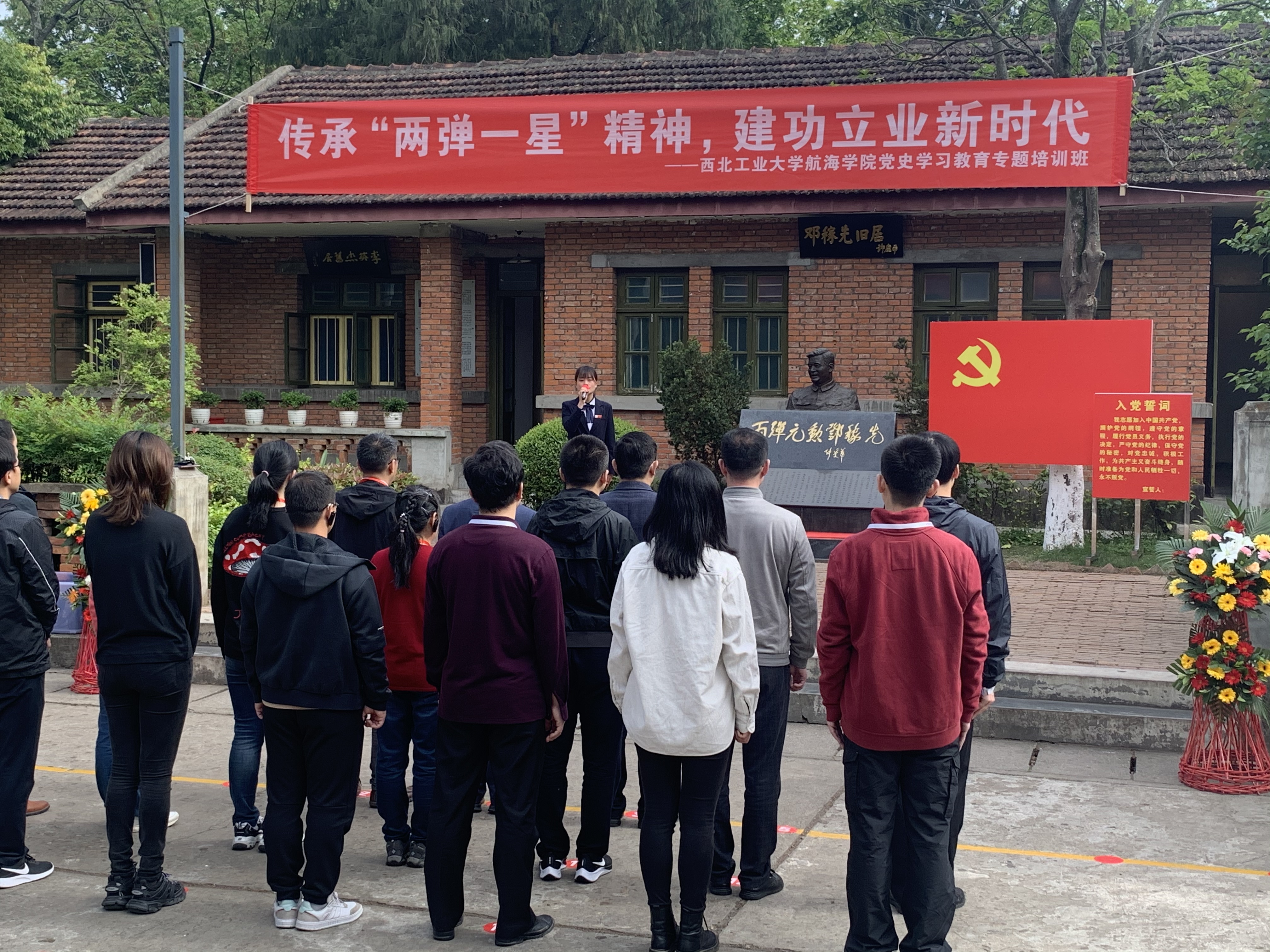 在梓潼两弹城,参观两弹历程馆、邓稼先故居、防空洞、两弹城廉洁文化基地,在讲解员的带领下,系统学习了两弹的研制过程与艰难历程。组织现场教学《两弹研制历程》与《鞠躬尽瘁,死而后已——两弹元勋邓稼先的故事》,在邓稼先故居前,向邓稼先铜像敬献鲜花并在党委书记孙华强的领誓下重温入党誓词。