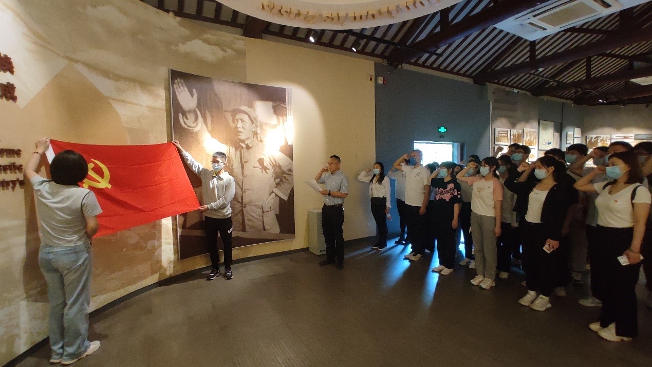 在纪念馆展厅一楼,面对鲜红的中国共产党党旗,孙华强庄重的举起右拳,带领预备党员入党宣誓,带领正式党员重温誓词,铿锵有力的宣誓声响彻大厅。