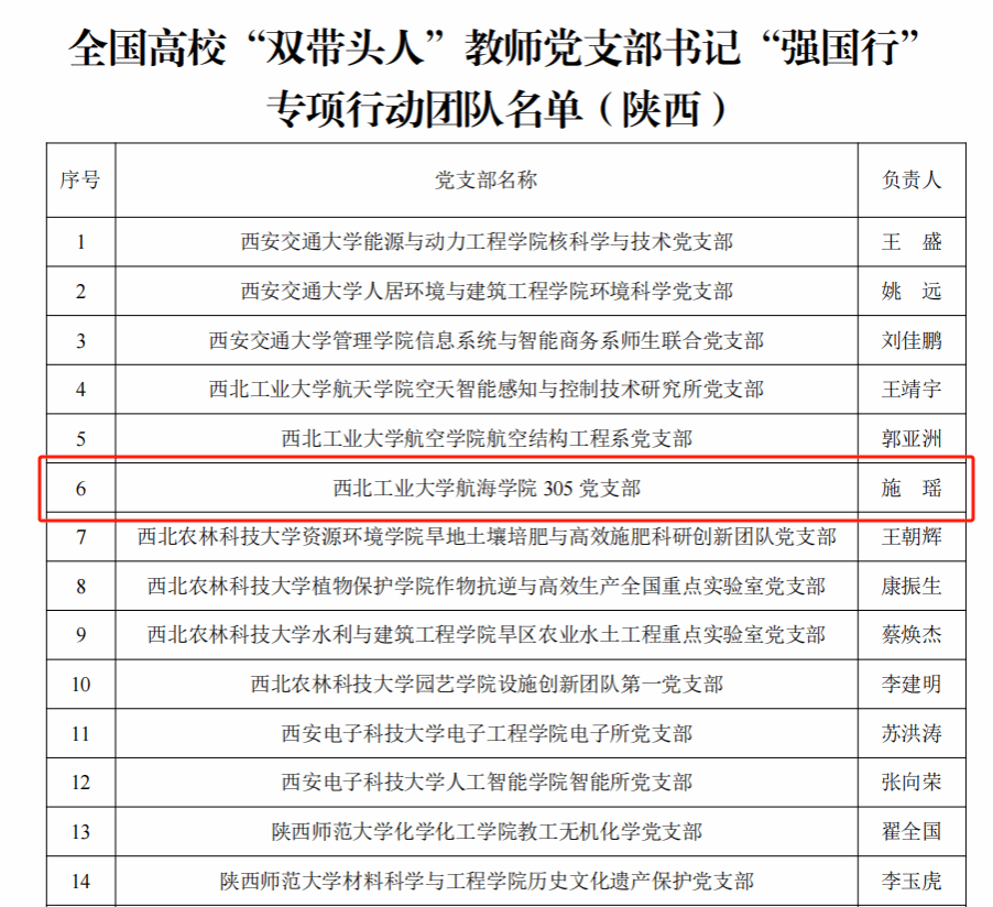 近日,教育部办公厅公布了首批全国高校“双带头人”教师党支部书记“强国行”专项行动团队名单,欧冠官网305党支部成功入选。这是305党支部继获批“全国党建工作样板支部”、陕西高校“双带头人”教师党支部书记工作室后,获得的又一殊荣。该支部的成功入选充分展示了近年来欧冠官网在学校党委的坚强领导下,扎实推进教师党支部“双带头人”培育工程,坚持“政治强、业务强、合力强”标准,不断提升党支部书记“胜任力、凝聚力和战斗力”,着力打造一支党建和业务双融合、双促进的党支部书记队伍的丰硕成果。