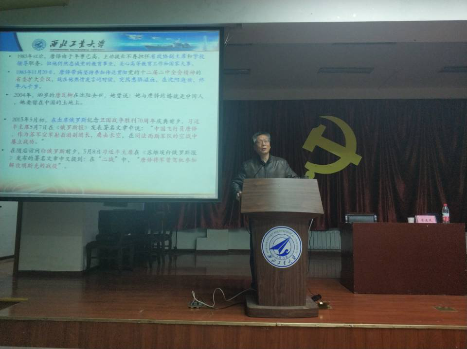 黄迪民教授以“不能忘却的华航西迁”为主题,讲述了西工大脉源三支的典型代表人物。以史鉴今,把握历史规律,黄迪民教授首先介绍了西工大前身的三所院校,讲述了西工大建立的历史。然后选择了与西工大建立有着千丝万缕联系的三位共产党前辈:刘海滨、寿松涛、唐铎,通过生活经历、革命斗争、现实意义等多角度地讲述了他们的事迹,凝练出他们的精神。