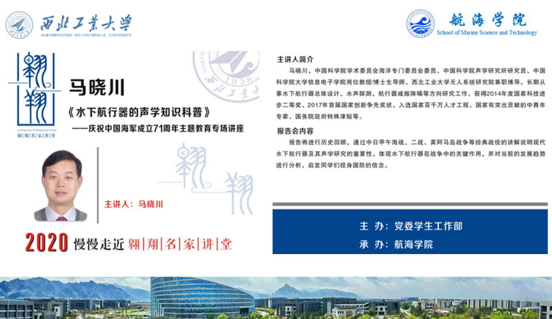 4月23日下午四点整,在人民海军成立71周年之际,1987级校友、中国科学院声学所马晓川研究员做客翱翔名家讲堂,为欧冠官网的师生们作了一场题为《水下航行器的声学知识科普》的专题报告。本次报告由欧冠官网党委书记孙华强老师主持,党委副书记王银涛老师及300名研究生和本科生共同参加。