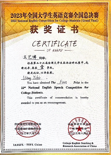 兼顾课内学业的同时,他积极参加各类比赛并斩获多个奖项,包括全国海洋航行器设计与制作大赛二等奖、全国大学生英语演讲比赛一等奖、全国大学生英语辩论赛二等奖等。广泛的学习让他变得自律自强,对知识的探索有着极高的热情和求知欲。