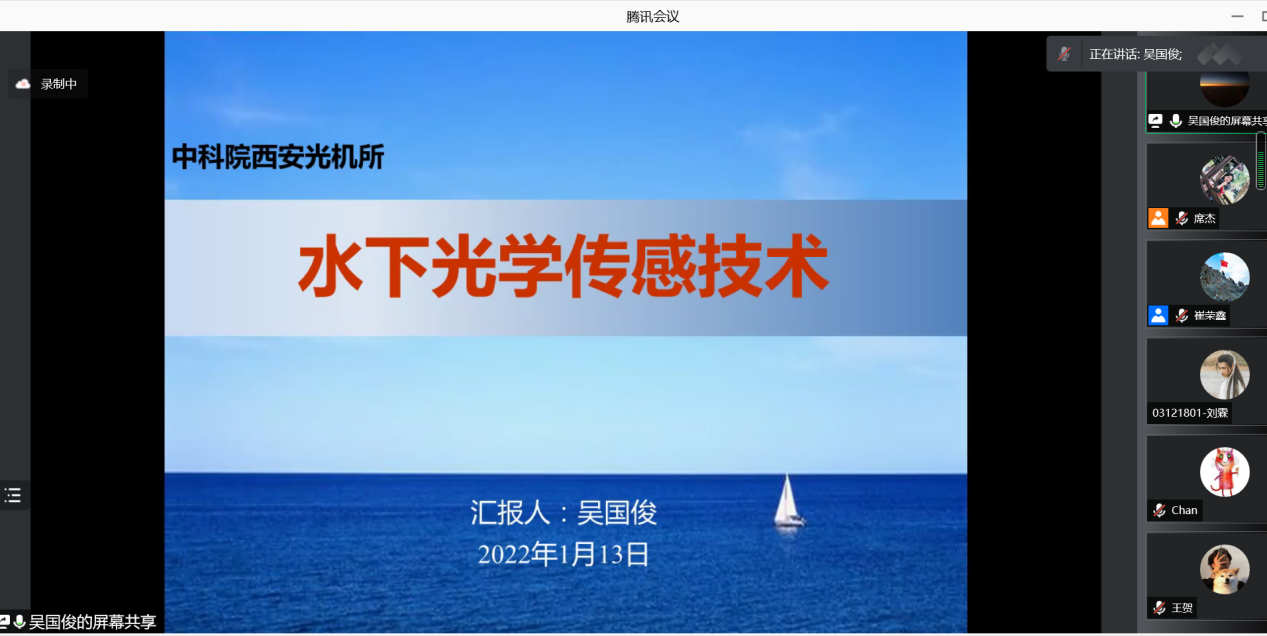 吴老师以“水下光学传感技术”为题,详细介绍了海洋的重要性、人类对海洋的了解、光与海洋的结合、光学探测机理及其应用与未来发展趋势。